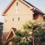 外壁はオレンジ色系ランダム調のモルタル、内部はしっくいの壁に杉材の腰板張りの会堂で集会しています。
