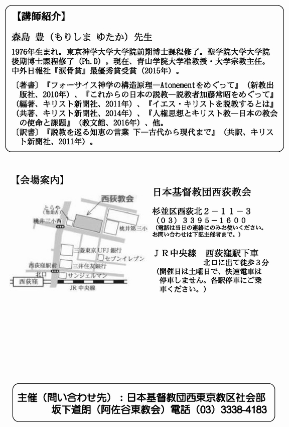 場所:日本基督教団西荻教会(東京都杉並区西荻北2-11-3 JR 西荻窪駅 北口より徒歩約3分)